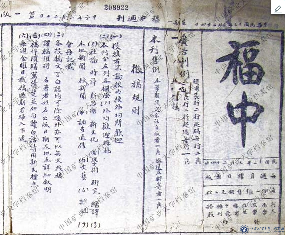1924年3月24日,《福中周刊》创刊。该刊每周星期日出版,16开,每份2张,每份售铜元2枚。该刊是焦作第一个“中华邮政特准挂号认为新闻纸类”的地方类刊物,它既为焦作新闻报,又是校报。创刊号上刊载的魏仁山的《“福中”的解释》阐释了刊名来源及办刊理念:刊名“福中”源于“学校是福中矿务大学”,另有一层含义是“‘造福中国’或‘替中国造福’”。“因为中国现在贫弱到极致了,都是因为人人都只想做官发财,把学实业做生产的事都不着眼。我们利用这个周刊,或可唤醒一般国民,使他回头向岸。至于矿业,中国现在研究的人尚少,算是仍在萌芽,我们还想藉这个周刊的作用,与国内同志交换知识,务期有所发明。又中国现在虽想振兴实业,但因社会、国家的不安静,你若集股开办工厂公司的时候,却有那匪或兵来搅扰你,我们仍要利用这个周刊,替国民设法去排除这种障碍。”