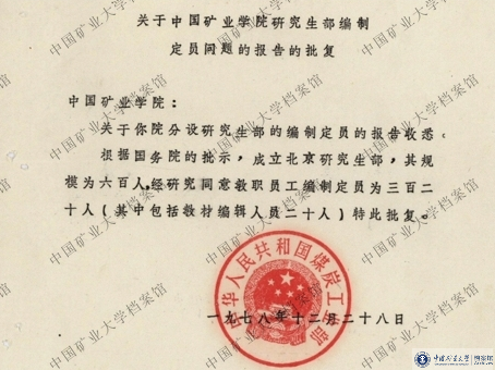 1978年12月28日,煤炭部以(78)煤教字1599号文件批复中国矿业学院:“根据国务院批示,成立北京研究生部,其规模为600人,研究同意教职员工编制为320人(其中包括教材编辑室人员20人)。”