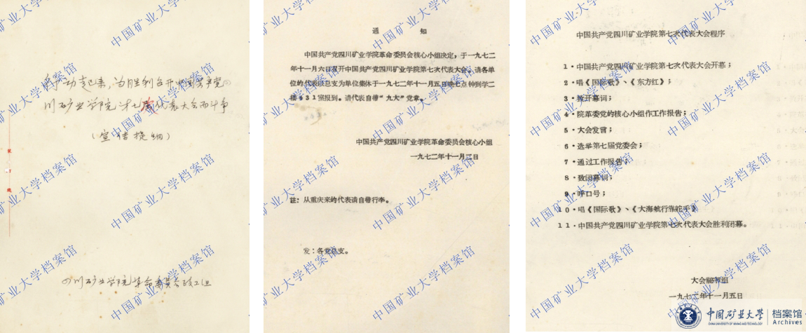 1972年11月6日,在四川省合川县(现为重庆市合川区)三汇坝校内召开了中共四川矿业学院第七次党员代表大会,出席大会的党员代表共181人,大会由17人组成主席团。
