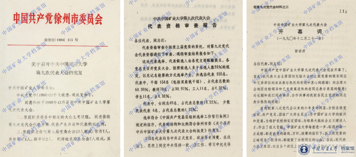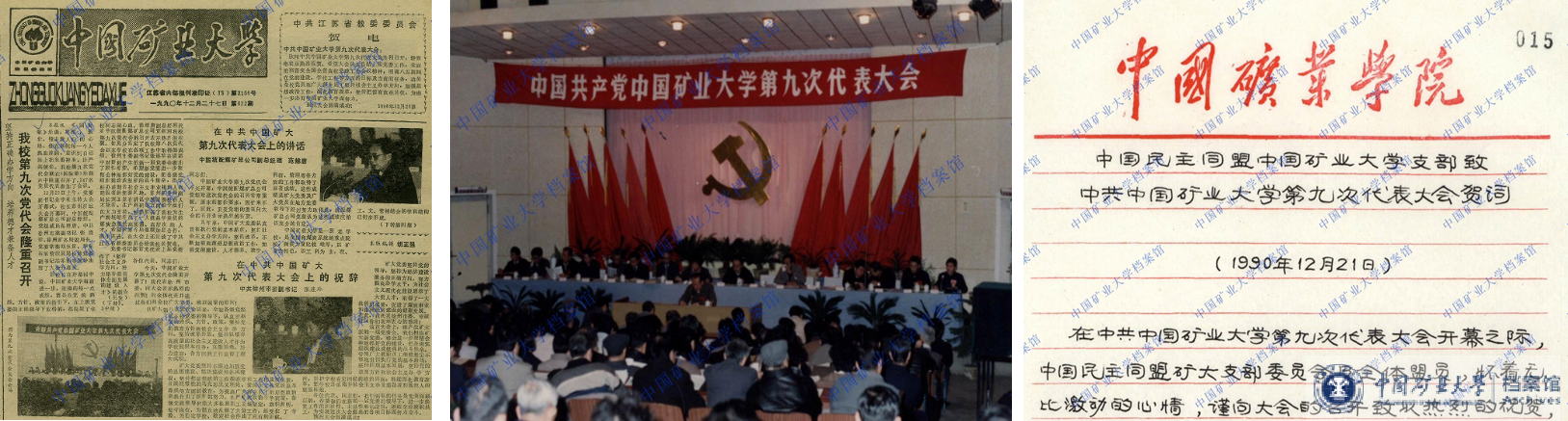 1990年12月21日,中共中国矿业大学第九次党员代表大会在徐州文昌校园科学馆隆重召开,出席大会的正式代表共247名。党委副书记主持大会开幕式,校长彭世济致开幕词。中国统配煤矿总公司、中共徐州市委、徐州矿务局代表到会祝贺并讲话,中共江苏省委教育委员会发贺电祝贺。